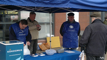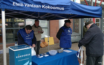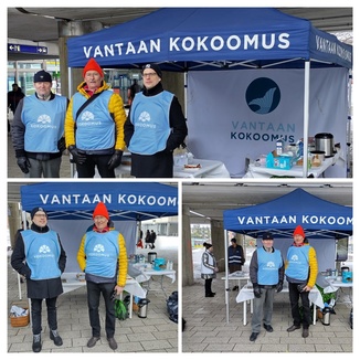 ![]() Etelä-Vantaan Kokoomuksen aktiivit jakamassa ilosanomaa Punamultatorilla 4.3.2023, Kuvassa Timo Nikkanen Markus Aarnio ja Risto Pyhältö |